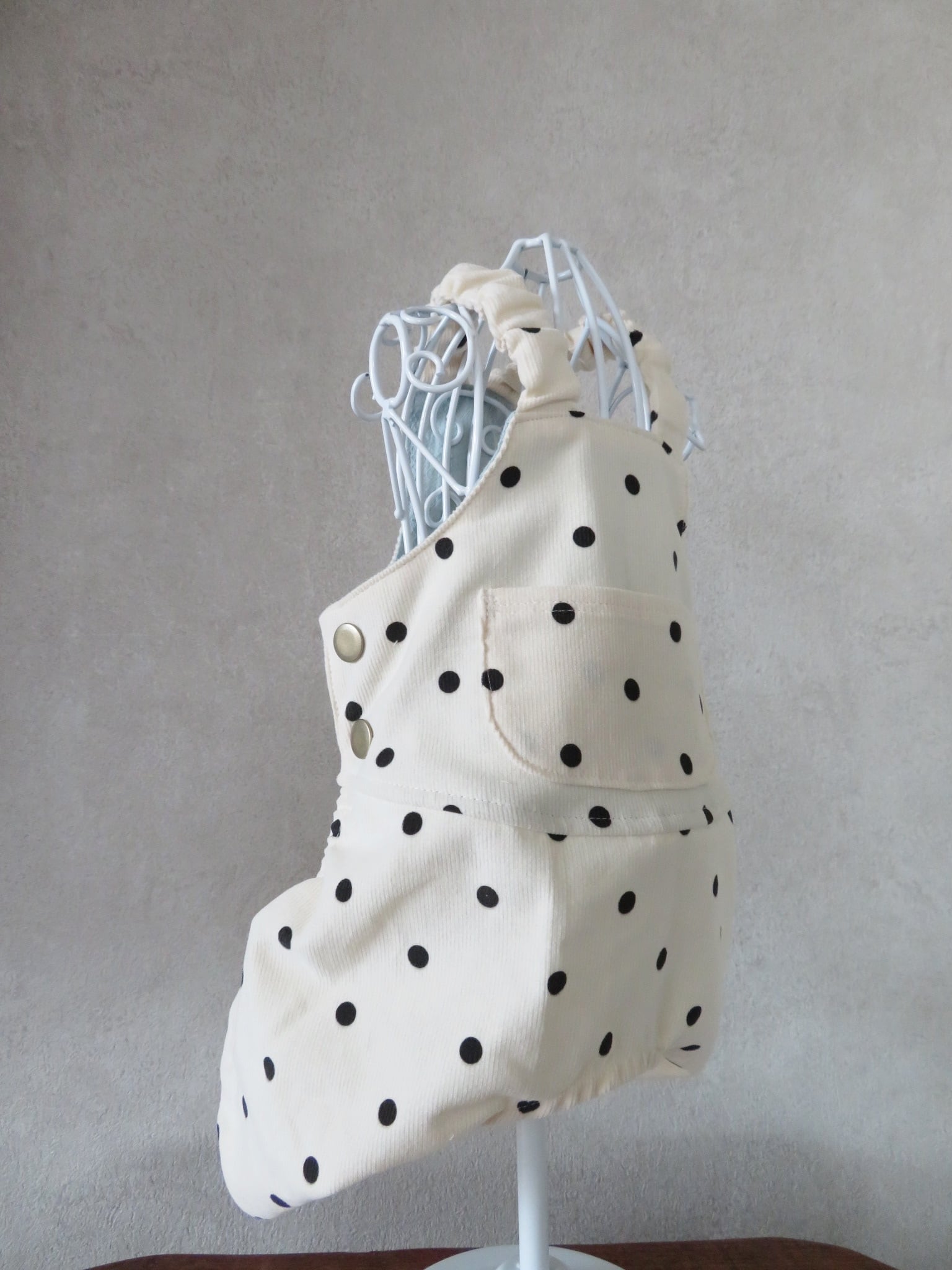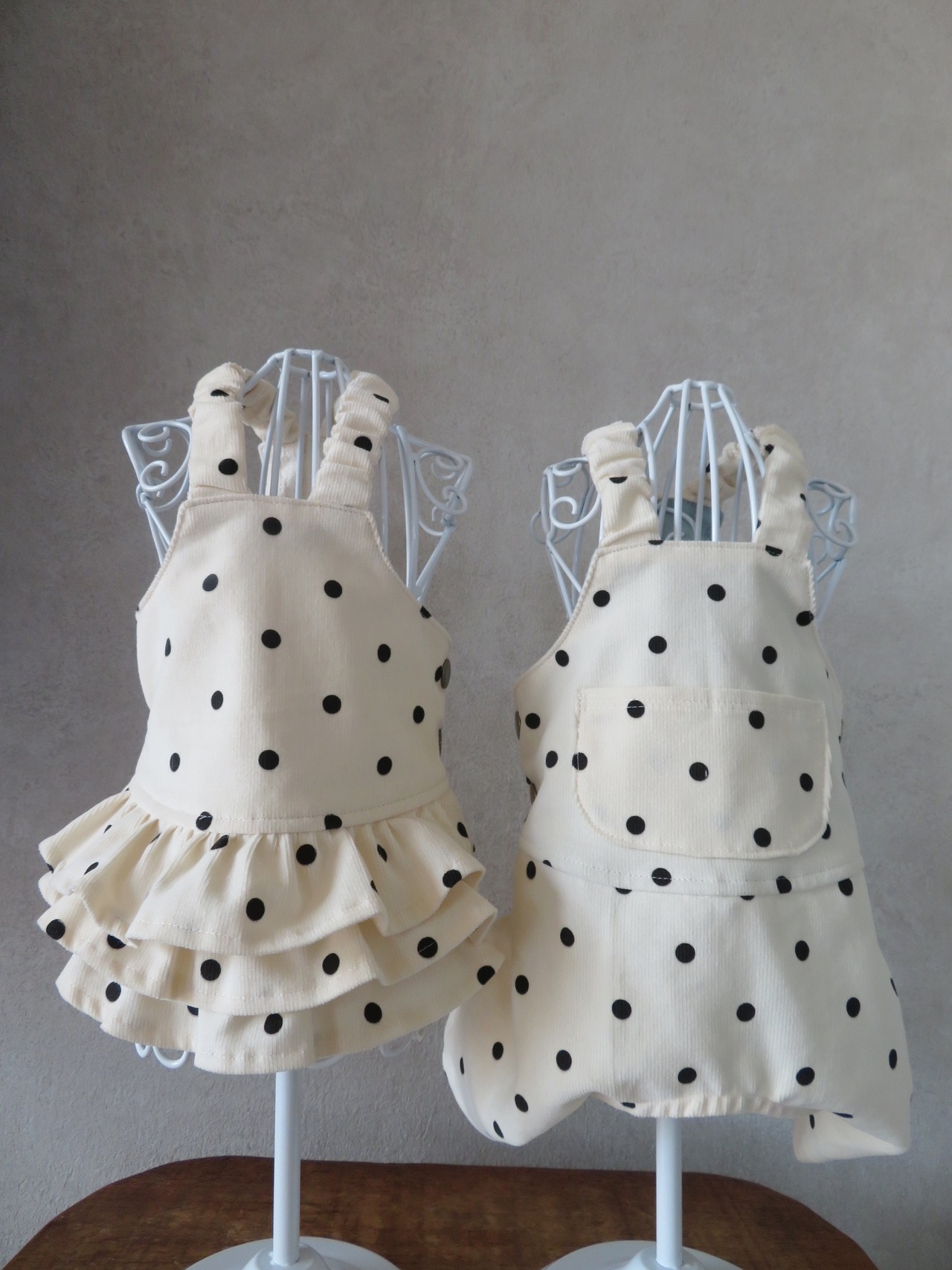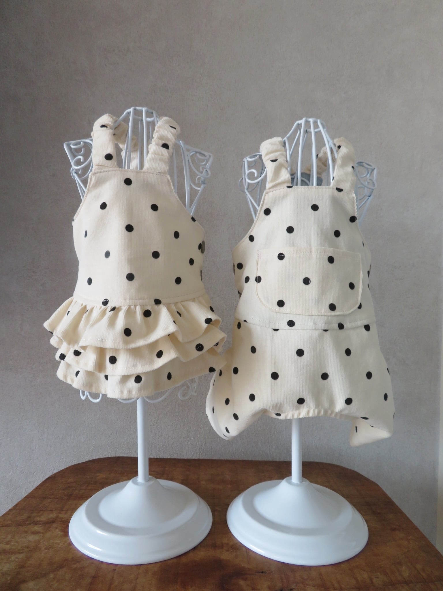 おしゃれなコーデュロイ素材に、愛らしいブラックドットが映えるオーバーオールとジャンバースカート♡