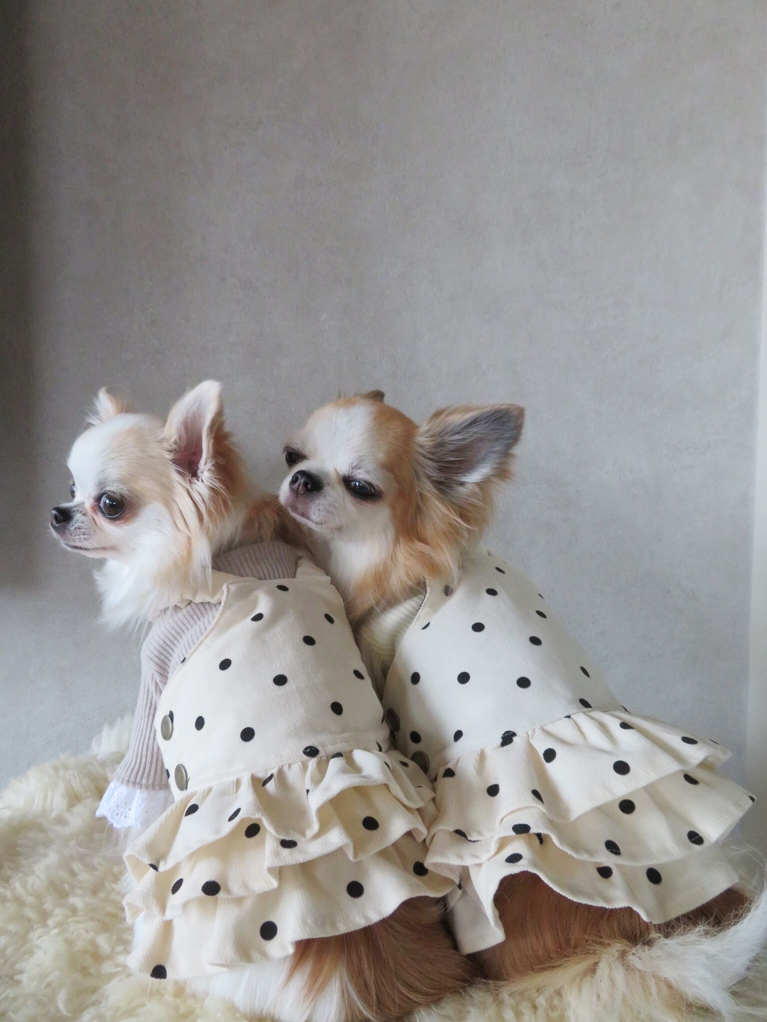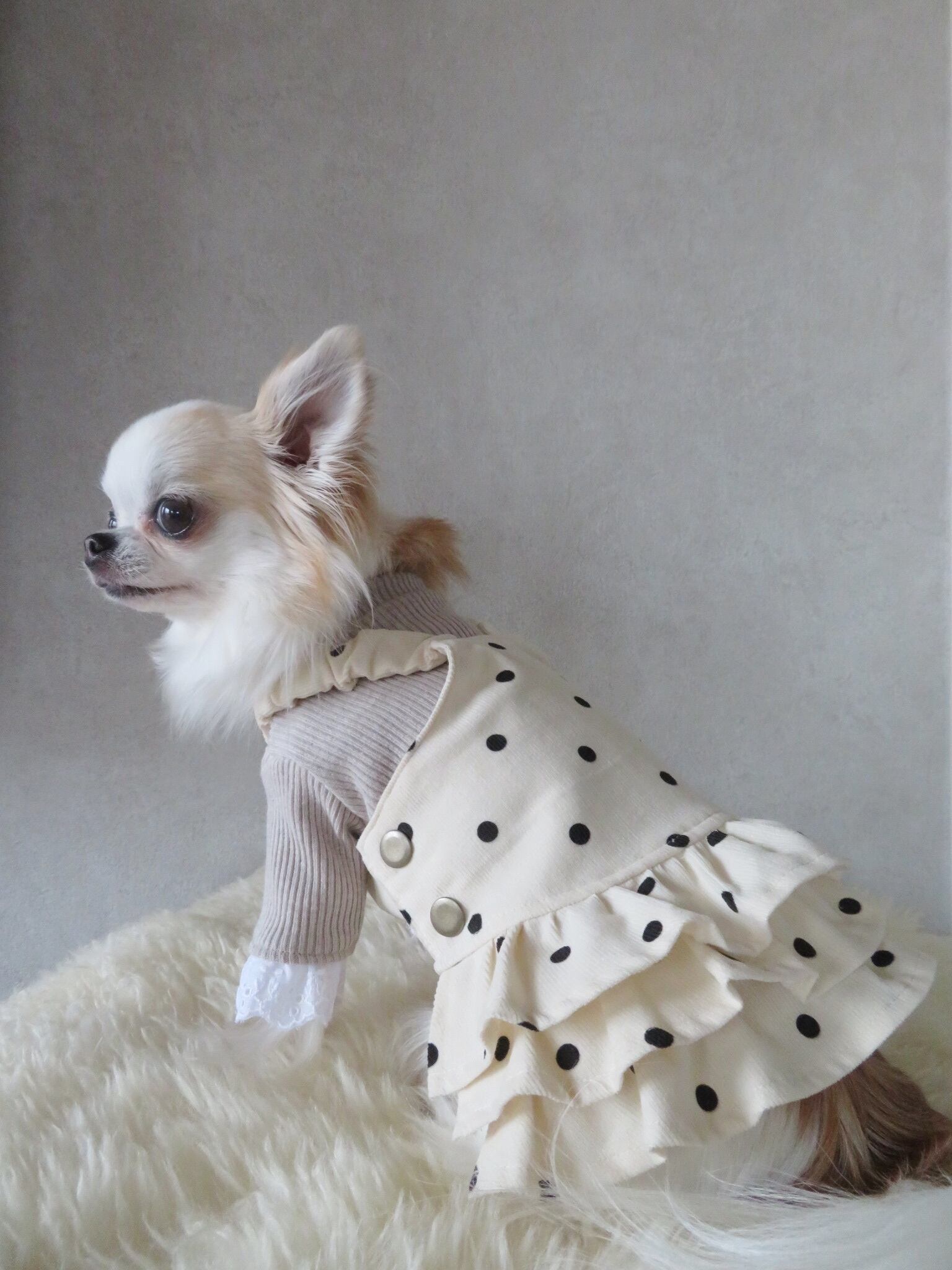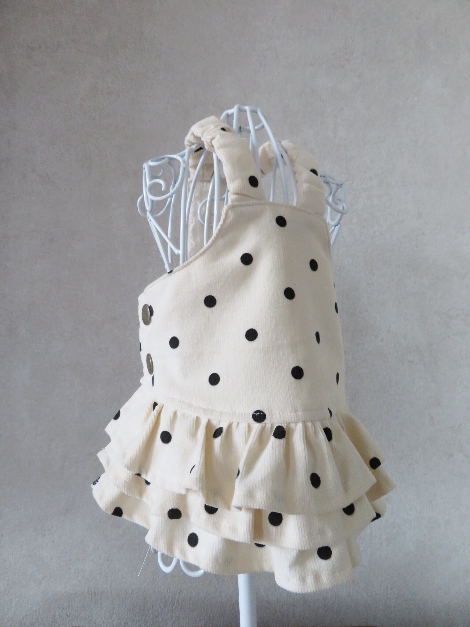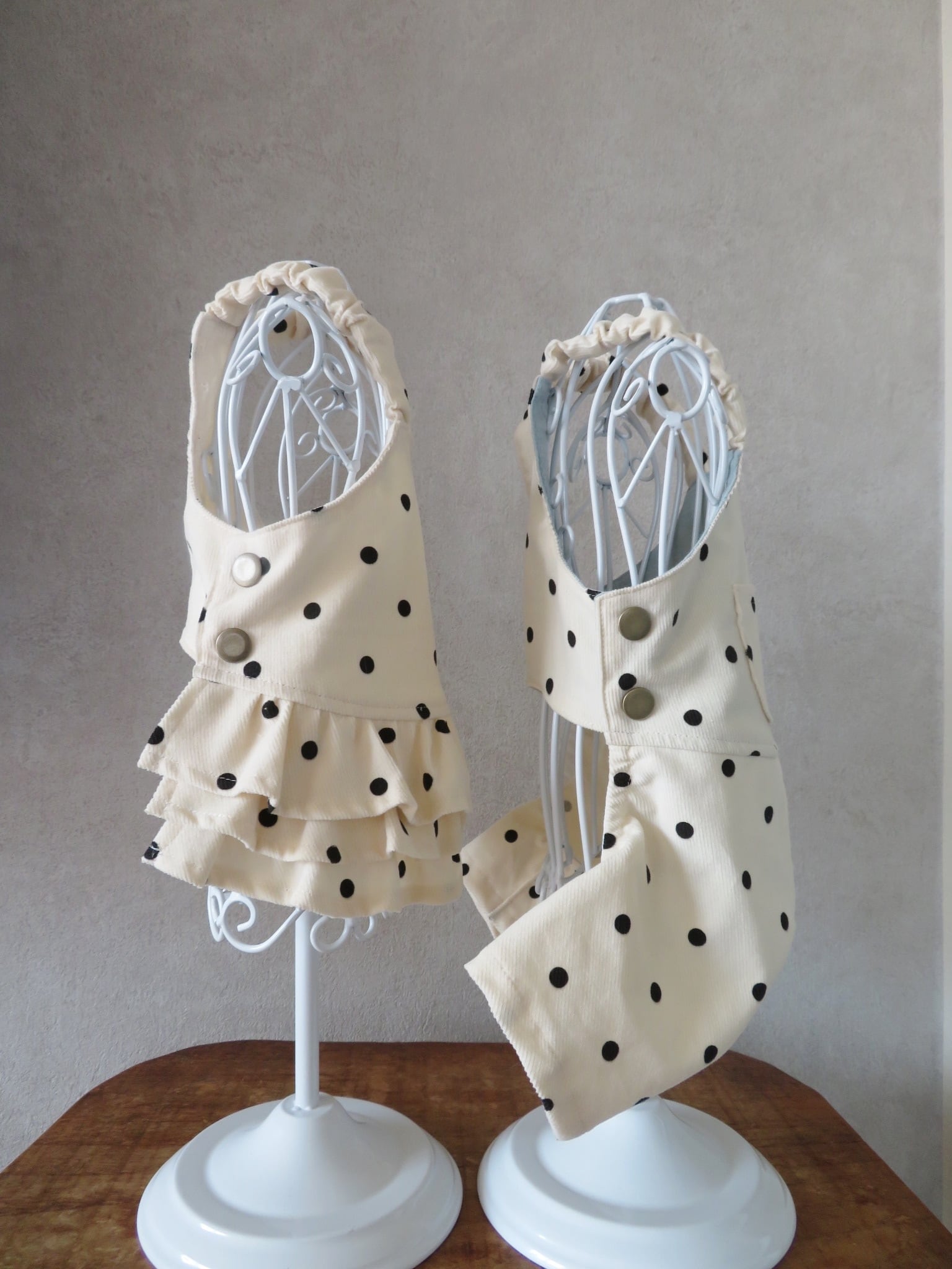 おしゃれなコーデュロイ素材に、愛らしいブラックドットが映えるオーバーオールとジャンバースカート♡
