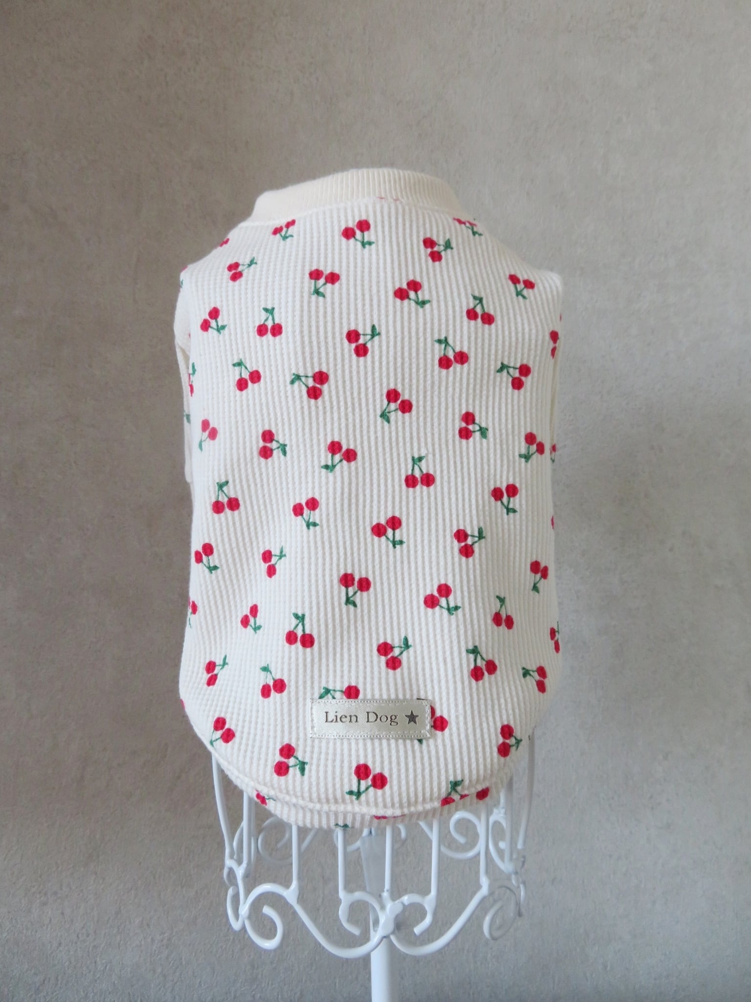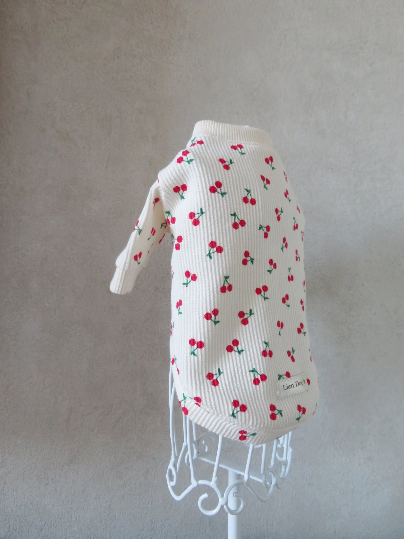 優しいアイボリーカラーに、小さな赤いチェリー柄が散りばめられた可愛らしいワッフルニットトップス。